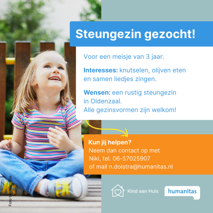 Humanitas Twente is voor een meisje van drie jaar op zoek naar een warm en rustig steungezin in Oldenzaal. Ze houdt erg van knutselen, samen liedjes zingen en olijven eten. Alle gezinsvormen zijn welkom!